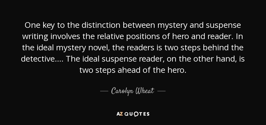 One key to the distinction between mystery and suspense writing involves the relative positions of hero and reader. In the ideal mystery novel, the readers is two steps behind the detective.... The ideal suspense reader, on the other hand, is two steps ahead of the hero.