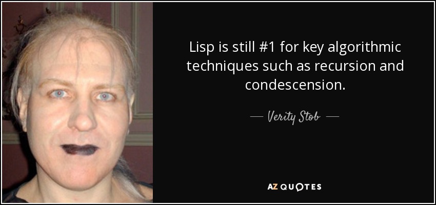 This does not mean that I fail to recognise that Lisp is still #1 for key algorithmic techniques such as recursion and condescension. It just means that I have no idea how, or indeed if, Lisp handles exceptions.