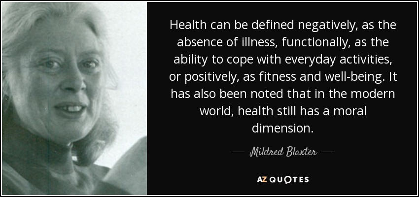 Health can be defined negatively, as the absence of illness, functionally, as the ability to cope with everyday activities, or positively, as fitness and well-being. It has also been noted that in the modern world, health still has a moral dimension.