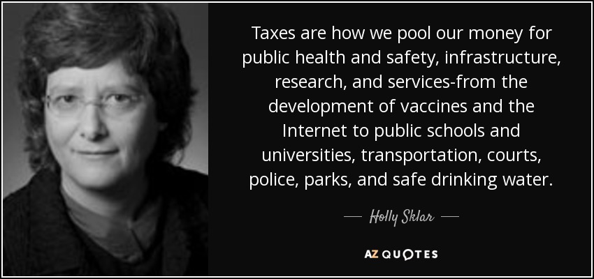 Taxes are how we pool our money for public health and safety, infrastructure, research, and services-from the development of vaccines and the Internet to public schools and universities, transportation, courts, police, parks, and safe drinking water.