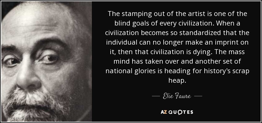 The stamping out of the artist is one of the blind goals of every civilization. When a civilization becomes so standardized that the individual can no longer make an imprint on it, then that civilization is dying. The mass mind has taken over and another set of national glories is heading for history's scrap heap.
