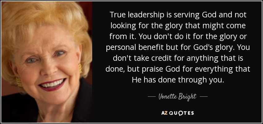 True leadership is serving God and not looking for the glory that might come from it. You don't do it for the glory or personal benefit but for God's glory. You don't take credit for anything that is done, but praise God for everything that He has done through you.