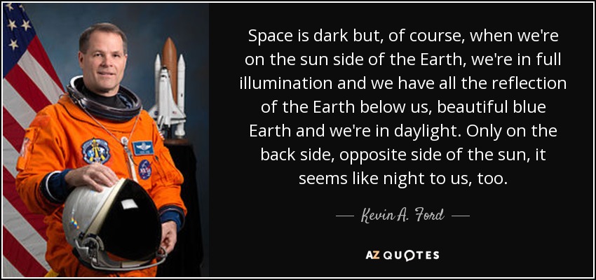 Space is dark but, of course, when we're on the sun side of the Earth, we're in full illumination and we have all the reflection of the Earth below us, beautiful blue Earth and we're in daylight. Only on the back side, opposite side of the sun, it seems like night to us, too.