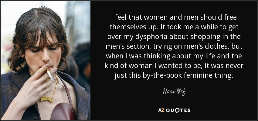 I feel that women and men should free themselves up. It took me a while to get over my dysphoria about shopping in the men's section, trying on men's clothes, but when I was thinking about my life and the kind of woman I wanted to be, it was never just this by-the-book feminine thing.