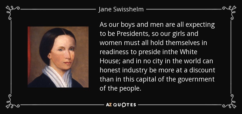 As our boys and men are all expecting to be Presidents, so our girls and women must all hold themselves in readiness to preside inthe White House; and in no city in the world can honest industry be more at a discount than in this capital of the government of the people.