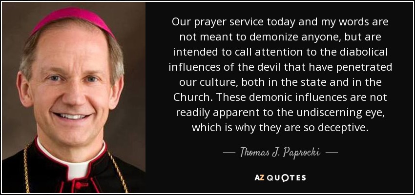 Our prayer service today and my words are not meant to demonize anyone, but are intended to call attention to the diabolical influences of the devil that have penetrated our culture, both in the state and in the Church. These demonic influences are not readily apparent to the undiscerning eye, which is why they are so deceptive.