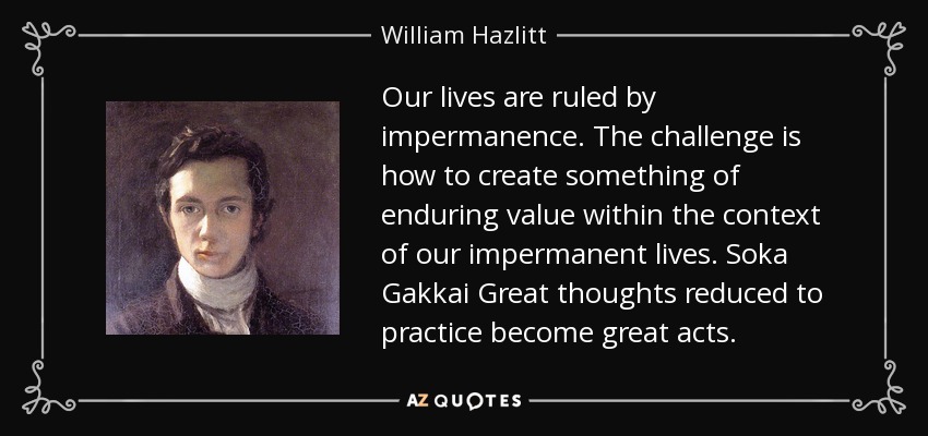 Our lives are ruled by impermanence. The challenge is how to create something of enduring value within the context of our impermanent lives. Soka Gakkai Great thoughts reduced to practice become great acts.