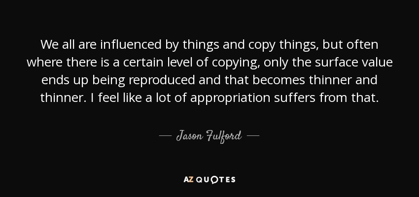We all are influenced by things and copy things, but often where there is a certain level of copying, only the surface value ends up being reproduced and that becomes thinner and thinner. I feel like a lot of appropriation suffers from that.
