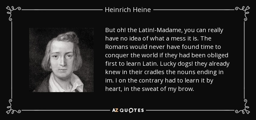 But oh! the Latin!-Madame, you can really have no idea of what a mess it is. The Romans would never have found time to conquer the world if they had been obliged first to learn Latin. Lucky dogs! they already knew in their cradles the nouns ending in im. I on the contrary had to learn it by heart, in the sweat of my brow.