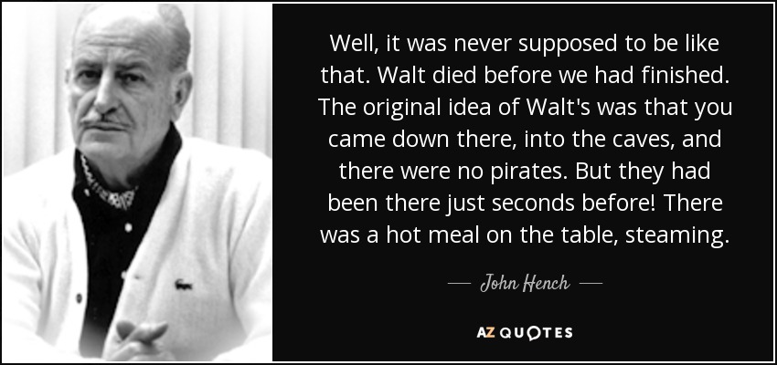 Well, it was never supposed to be like that. Walt died before we had finished. The original idea of Walt's was that you came down there, into the caves, and there were no pirates. But they had been there just seconds before! There was a hot meal on the table, steaming.