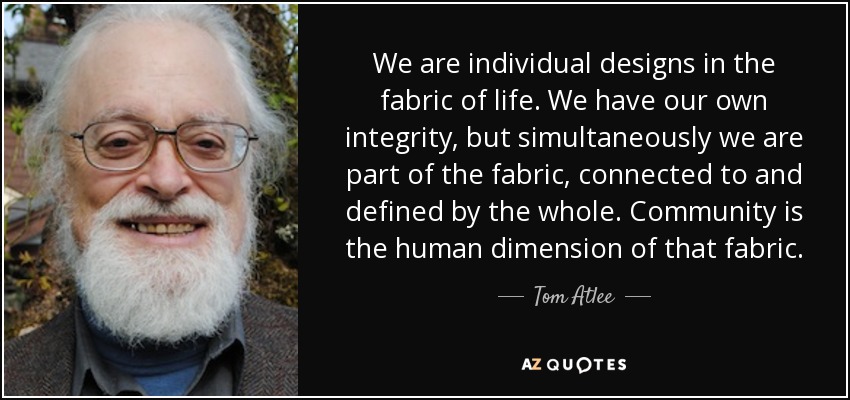 We are individual designs in the fabric of life. We have our own integrity, but simultaneously we are part of the fabric, connected to and defined by the whole. Community is the human dimension of that fabric.