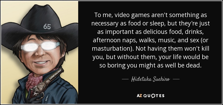 To me, video games aren't something as necessary as food or sleep, but they're just as important as delicious food, drinks, afternoon naps, walks, music, and sex (or masturbation). Not having them won't kill you, but without them, your life would be so boring you might as well be dead.
