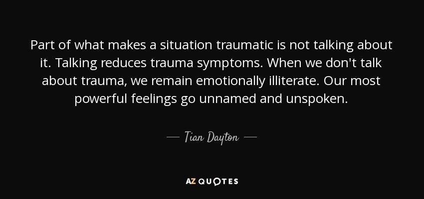 Part of what makes a situation traumatic is not talking about it. Talking reduces trauma symptoms. When we don't talk about trauma, we remain emotionally illiterate. Our most powerful feelings go unnamed and unspoken.