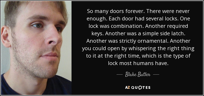 So many doors forever. There were never enough. Each door had several locks. One lock was combination. Another required keys. Another was a simple side latch. Another was strictly ornamental. Another you could open by whispering the right thing to it at the right time, which is the type of lock most humans have.