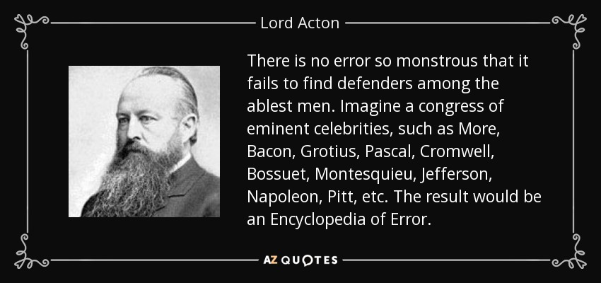 There is no error so monstrous that it fails to find defenders among the ablest men. Imagine a congress of eminent celebrities, such as More, Bacon, Grotius, Pascal, Cromwell, Bossuet, Montesquieu, Jefferson, Napoleon, Pitt, etc. The result would be an Encyclopedia of Error.