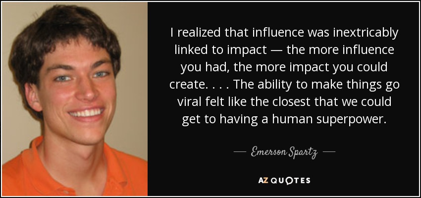 I realized that influence was inextricably linked to impact — the more influence you had, the more impact you could create. . . . The ability to make things go viral felt like the closest that we could get to having a human superpower.