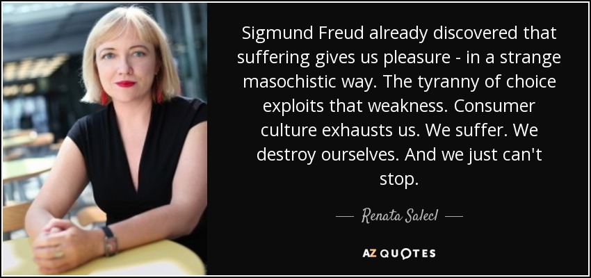 Sigmund Freud already discovered that suffering gives us pleasure - in a strange masochistic way. The tyranny of choice exploits that weakness. Consumer culture exhausts us. We suffer. We destroy ourselves. And we just can't stop.