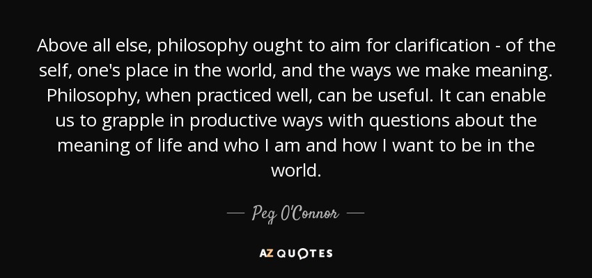 Above all else, philosophy ought to aim for clarification - of the self, one's place in the world, and the ways we make meaning. Philosophy, when practiced well, can be useful. It can enable us to grapple in productive ways with questions about the meaning of life and who I am and how I want to be in the world.