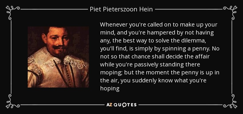 Whenever you're called on to make up your mind, and you're hampered by not having any, the best way to solve the dilemma, you'll find, is simply by spinning a penny. No not so that chance shall decide the affair while you're passively standing there moping; but the moment the penny is up in the air, you suddenly know what you're hoping