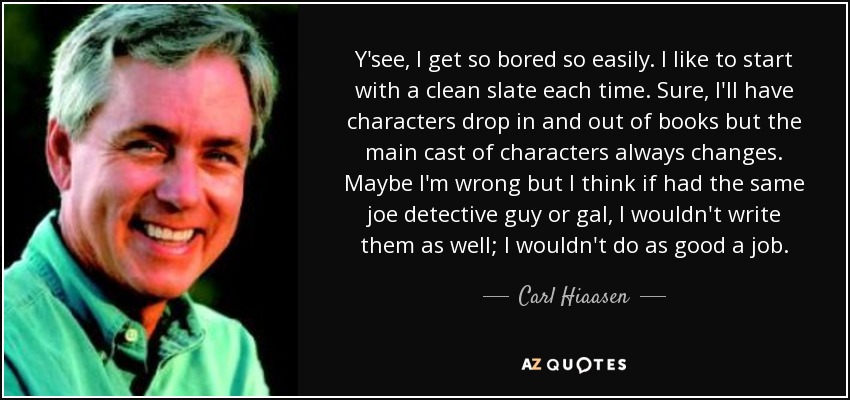 Y'see, I get so bored so easily. I like to start with a clean slate each time. Sure, I'll have characters drop in and out of books but the main cast of characters always changes. Maybe I'm wrong but I think if had the same joe detective guy or gal, I wouldn't write them as well; I wouldn't do as good a job.