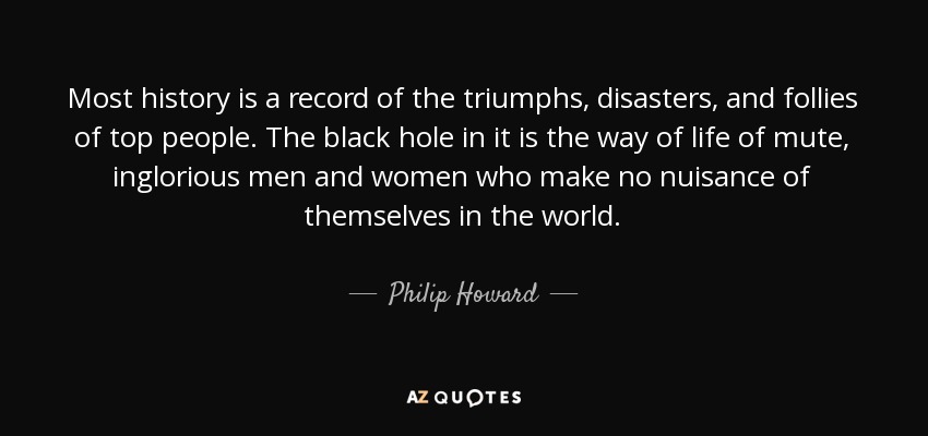 Most history is a record of the triumphs, disasters, and follies of top people. The black hole in it is the way of life of mute, inglorious men and women who make no nuisance of themselves in the world.
