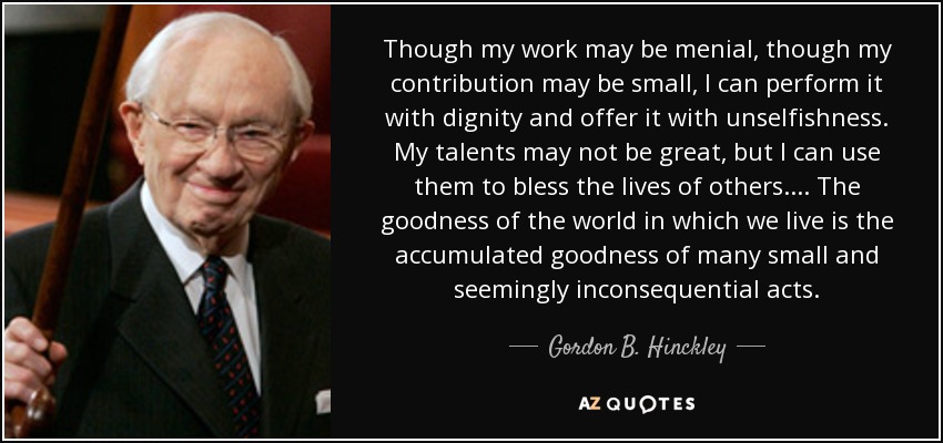 Though my work may be menial, though my contribution may be small, I can perform it with dignity and offer it with unselfishness. My talents may not be great, but I can use them to bless the lives of others.... The goodness of the world in which we live is the accumulated goodness of many small and seemingly inconsequential acts.