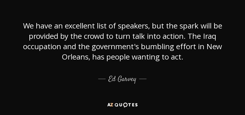 We have an excellent list of speakers, but the spark will be provided by the crowd to turn talk into action. The Iraq occupation and the government's bumbling effort in New Orleans, has people wanting to act.