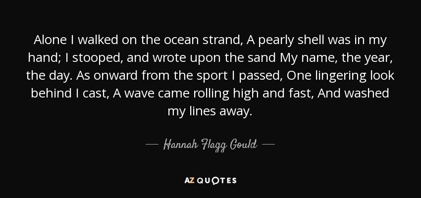 Alone I walked on the ocean strand, A pearly shell was in my hand; I stooped, and wrote upon the sand My name, the year, the day. As onward from the sport I passed, One lingering look behind I cast, A wave came rolling high and fast, And washed my lines away.