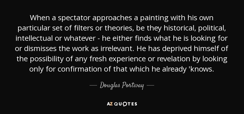 When a spectator approaches a painting with his own particular set of filters or theories, be they historical, political, intellectual or whatever - he either finds what he is looking for or dismisses the work as irrelevant. He has deprived himself of the possibility of any fresh experience or revelation by looking only for confirmation of that which he already 'knows.