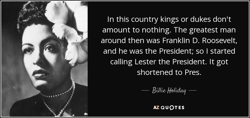 In this country kings or dukes don't amount to nothing. The greatest man around then was Franklin D. Roosevelt, and he was the President; so I started calling Lester the President. It got shortened to Pres.
