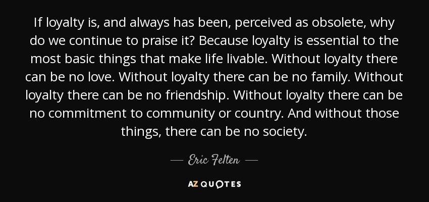 If loyalty is, and always has been, perceived as obsolete, why do we continue to praise it? Because loyalty is essential to the most basic things that make life livable. Without loyalty there can be no love. Without loyalty there can be no family. Without loyalty there can be no friendship. Without loyalty there can be no commitment to community or country. And without those things, there can be no society.