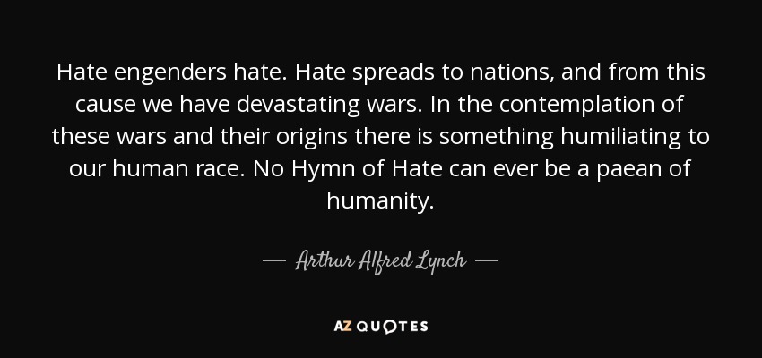 Hate engenders hate. Hate spreads to nations, and from this cause we have devastating wars. In the contemplation of these wars and their origins there is something humiliating to our human race. No Hymn of Hate can ever be a paean of humanity.
