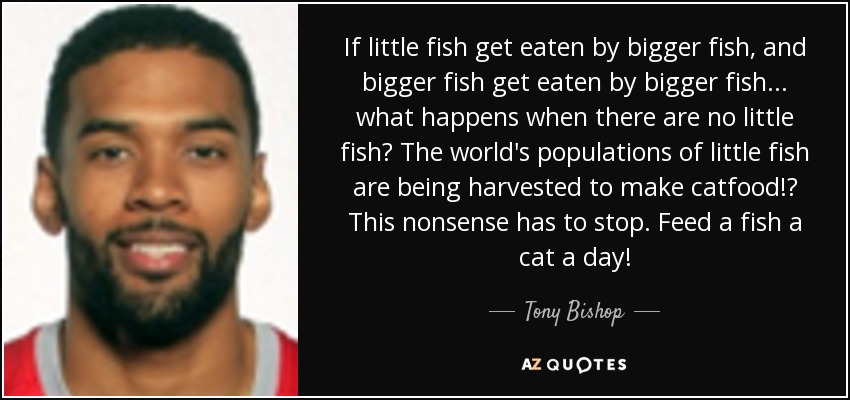 If little fish get eaten by bigger fish, and bigger fish get eaten by bigger fish... what happens when there are no little fish? The world's populations of little fish are being harvested to make catfood!? This nonsense has to stop. Feed a fish a cat a day!