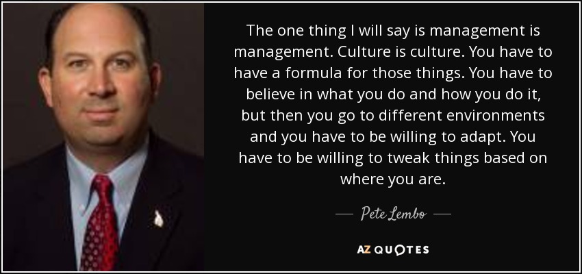 The one thing I will say is management is management. Culture is culture. You have to have a formula for those things. You have to believe in what you do and how you do it, but then you go to different environments and you have to be willing to adapt. You have to be willing to tweak things based on where you are.