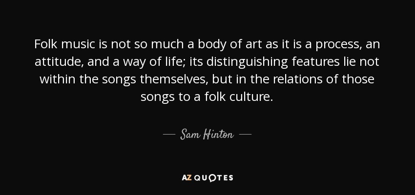 Folk music is not so much a body of art as it is a process, an attitude, and a way of life; its distinguishing features lie not within the songs themselves, but in the relations of those songs to a folk culture.
