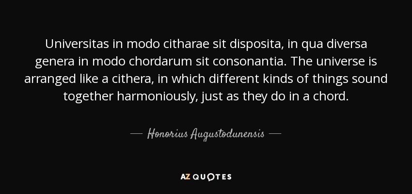 Universitas in modo citharae sit disposita, in qua diversa genera in modo chordarum sit consonantia. The universe is arranged like a cithera, in which different kinds of things sound together harmoniously, just as they do in a chord.