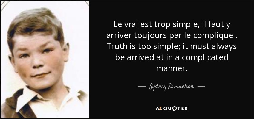 Le vrai est trop simple, il faut y arriver toujours par le complique . Truth is too simple; it must always be arrived at in a complicated manner.