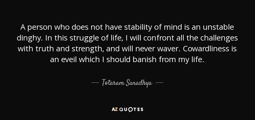 A person who does not have stability of mind is an unstable dinghy. In this struggle of life, I will confront all the challenges with truth and strength, and will never waver. Cowardliness is an eveil which I should banish from my life.