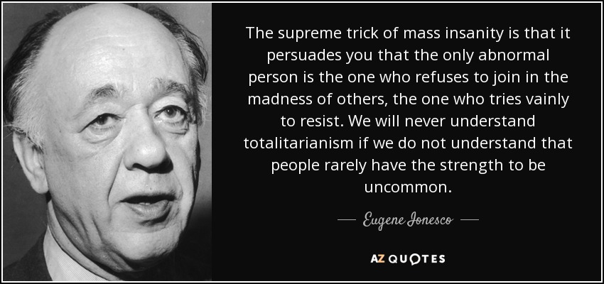 The supreme trick of mass insanity is that it persuades you that the only abnormal person is the one who refuses to join in the madness of others, the one who tries vainly to resist. We will never understand totalitarianism if we do not understand that people rarely have the strength to be uncommon.