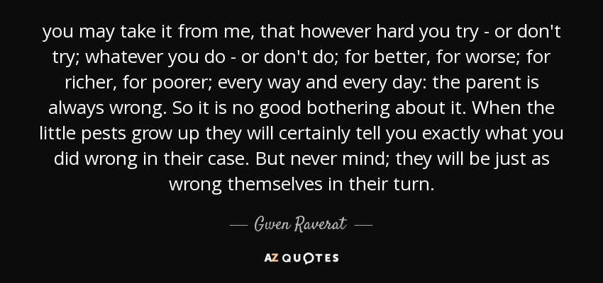you may take it from me, that however hard you try - or don't try; whatever you do - or don't do; for better, for worse; for richer, for poorer; every way and every day: the parent is always wrong. So it is no good bothering about it. When the little pests grow up they will certainly tell you exactly what you did wrong in their case. But never mind; they will be just as wrong themselves in their turn.
