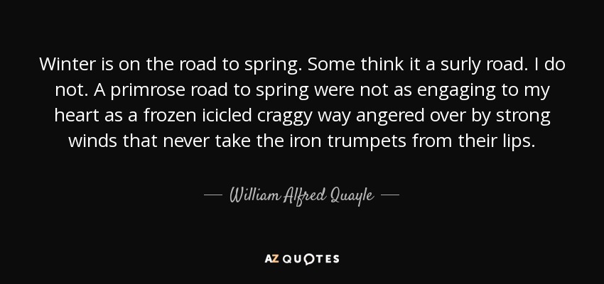 Winter is on the road to spring. Some think it a surly road. I do not. A primrose road to spring were not as engaging to my heart as a frozen icicled craggy way angered over by strong winds that never take the iron trumpets from their lips.