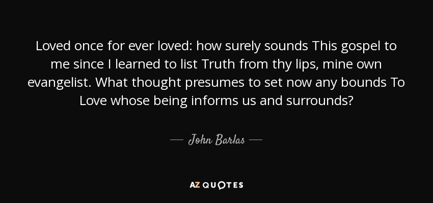 Loved once for ever loved: how surely sounds This gospel to me since I learned to list Truth from thy lips, mine own evangelist. What thought presumes to set now any bounds To Love whose being informs us and surrounds?