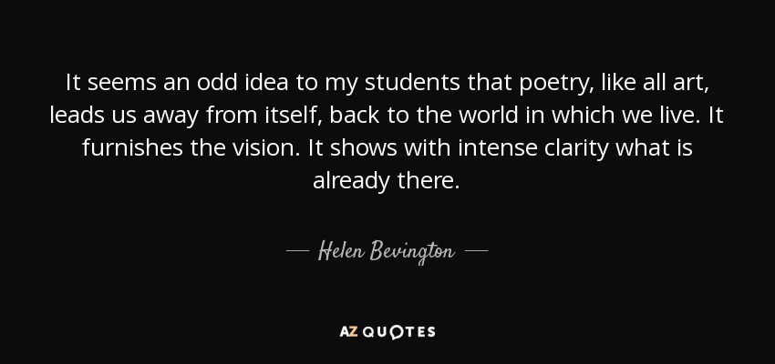 It seems an odd idea to my students that poetry, like all art, leads us away from itself, back to the world in which we live. It furnishes the vision. It shows with intense clarity what is already there.