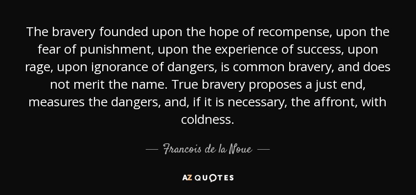 The bravery founded upon the hope of recompense, upon the fear of punishment, upon the experience of success, upon rage, upon ignorance of dangers, is common bravery, and does not merit the name. True bravery proposes a just end, measures the dangers, and, if it is necessary, the affront, with coldness.