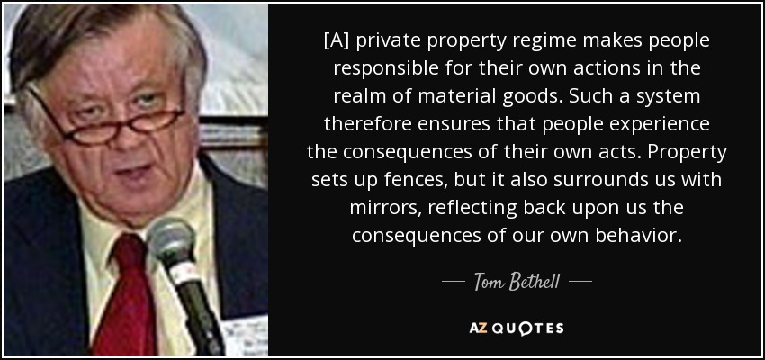 [A] private property regime makes people responsible for their own actions in the realm of material goods. Such a system therefore ensures that people experience the consequences of their own acts. Property sets up fences, but it also surrounds us with mirrors, reflecting back upon us the consequences of our own behavior.