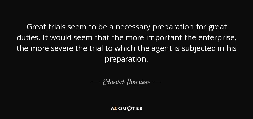 Great trials seem to be a necessary preparation for great duties. It would seem that the more important the enterprise, the more severe the trial to which the agent is subjected in his preparation.