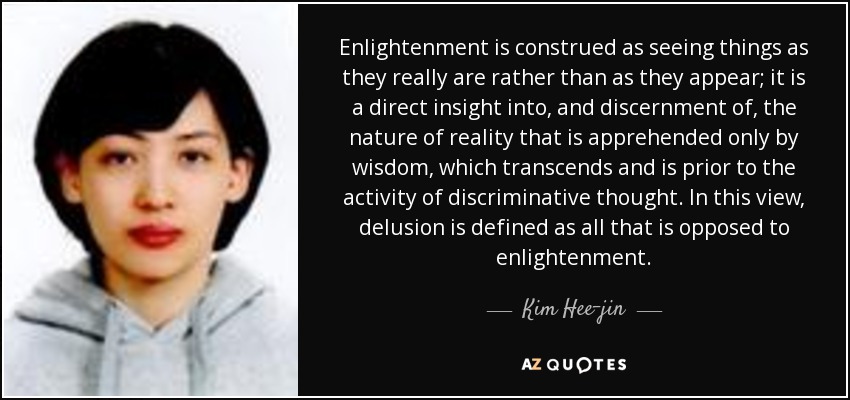 Enlightenment is construed as seeing things as they really are rather than as they appear; it is a direct insight into, and discernment of, the nature of reality that is apprehended only by wisdom, which transcends and is prior to the activity of discriminative thought. In this view, delusion is defined as all that is opposed to enlightenment.