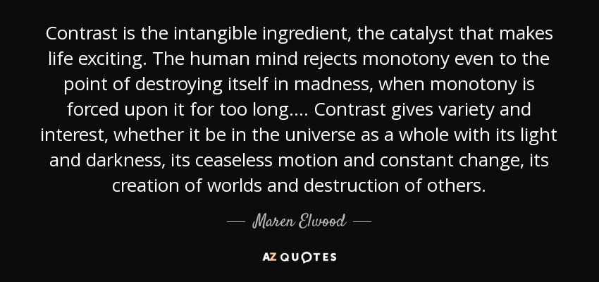 Contrast is the intangible ingredient, the catalyst that makes life exciting. The human mind rejects monotony even to the point of destroying itself in madness, when monotony is forced upon it for too long. ... Contrast gives variety and interest, whether it be in the universe as a whole with its light and darkness, its ceaseless motion and constant change, its creation of worlds and destruction of others.