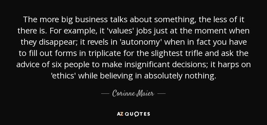 The more big business talks about something, the less of it there is. For example, it 'values' jobs just at the moment when they disappear; it revels in 'autonomy' when in fact you have to fill out forms in triplicate for the slightest trifle and ask the advice of six people to make insignificant decisions; it harps on 'ethics' while believing in absolutely nothing.
