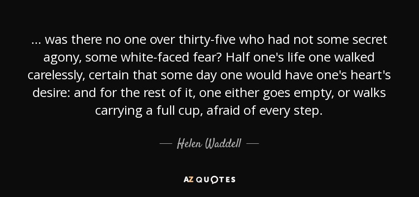 ... was there no one over thirty-five who had not some secret agony, some white-faced fear? Half one's life one walked carelessly, certain that some day one would have one's heart's desire: and for the rest of it, one either goes empty, or walks carrying a full cup, afraid of every step.